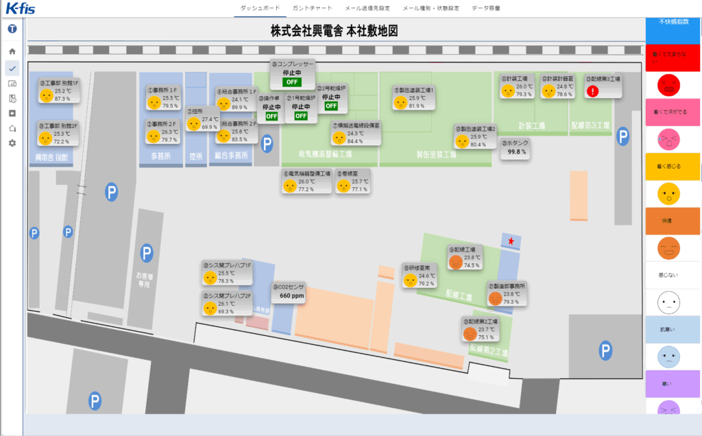 K-fis状態監視システムを導入し、工場や事務所の各所に温湿度監視センサーを設置しました。